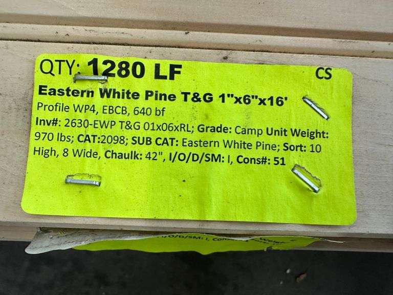Eastern White Pine T&G 1"x6"x16'. Profile WP4, ECEB, 640 Board Foot Grade: Camp *Condition Notes: Splits/Cracks, Please See Photos* Weight: 970. Sold by: Linear Foot. Sold as: Price x Quantity.
