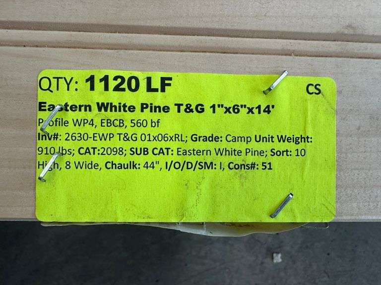 Eastern White Pine T&G 1"x6"x14'. Profile WP4, ECEB, 560 Board Foot Grade: Camp *Condition Notes: Splits/Cracks, Please See Photos* Weight: 910. Sold by: Linear Foot. Sold as: Price x Quantity.