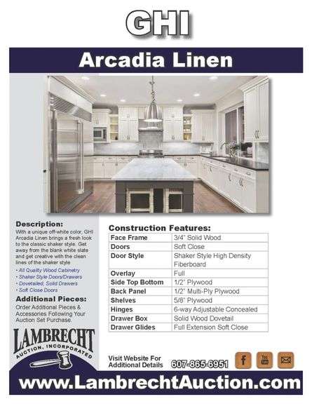 Arcadia Linen Kitchen Cabinet Set 10'x12'. Standard Layout, 30" Walls, By GHI, ADDITIONAL CABINETS ARE UNAVAILABLE BECAUSE THIS PRODUCT LINE IS DISCONTINUED. -3/4” Solid Wood Face Frame -High Density Fiberboard Shaker Style Door and Drawer Front -1/2” Plywood Box Construction -5/8” Plywood Shelves -Full Overlay Doors and Drawer Fronts -Solid Wood Dovetail Drawer box -Soft Close Full Extension Drawer Gliders -Soft Close Doors -6-Way Adjustable Concealed Hinges. Enclosed in each cabinet set will be a Build Sheet which lists the individual cabinets in each set. As the cabinets are palletized each cabinet will be checked off and signed by our staff member to ensure that the set is complete at the time of pick-up. Please keep this Build Sheet on hand because it will be required if there is an issue with your cabinet set. Cabinet issues will not be addressed without this build sheet. Weight: x. Sold by: Set. Sold as: Price x Quantity.