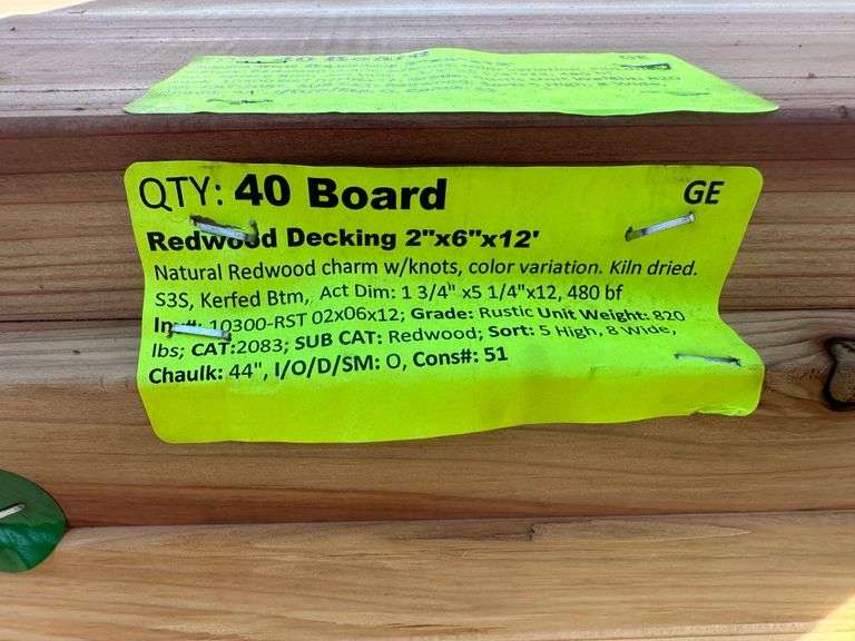 Redwood Decking 2"x6"x12". Natural Redwood, Charm With Knots, Color Variation, Kiln Dried, S3S, Kerfed Bottom, Actual Dimensions: 1 3/4"x5 1/4"x12', 480 Board Foot, Grade: Rustic, *Condition Note: Split/Chipped Edges, Please See Photos* Weight: 820. Sold by: Board. Sold as: Price x Quantity.