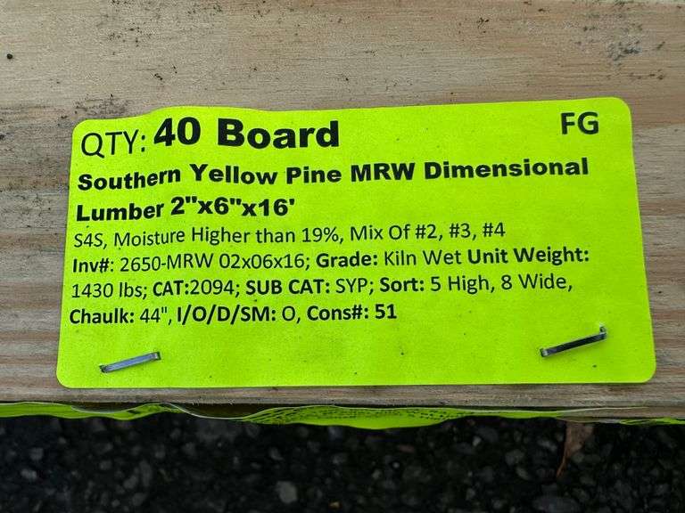 Southern Yellow Pine MRW Dimensional Lumber 2"x6"x16'. S4S, Moisture Higher Than 19%, Mix of #2, #3, #4, Grade: Kiln Wet, *Condition Notes: Mold, Please See Photos* Weight: 1430. Sold by: Board. Sold as: Price x Quantity.