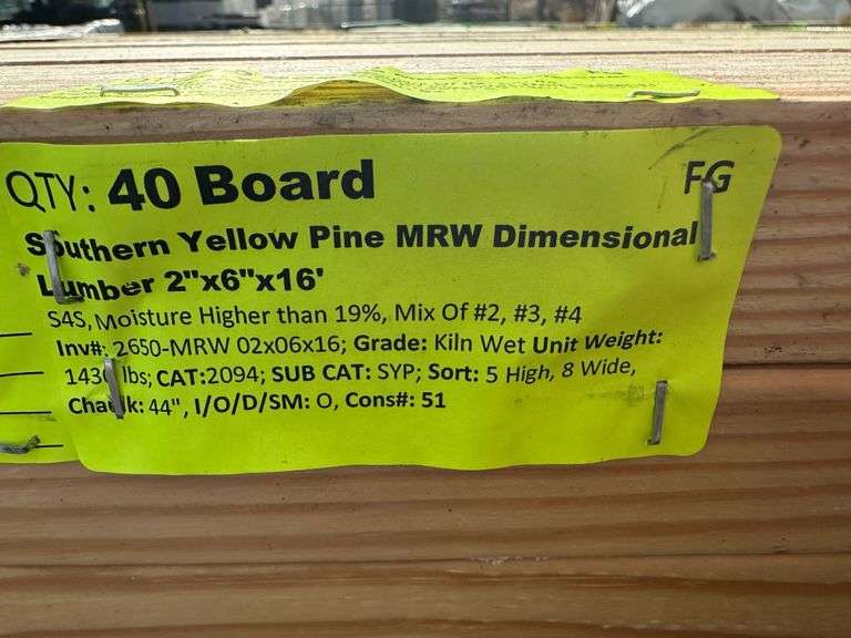Southern Yellow Pine MRW Dimensional Lumber 2"x6"x16'. S4S, Moisture Higher Than 19%, Mix of #2, #3, #4, Grade: Kiln Wet, *Condition Notes: Mold, Please See Photos* Weight: 1430. Sold by: Board. Sold as: Price x Quantity.