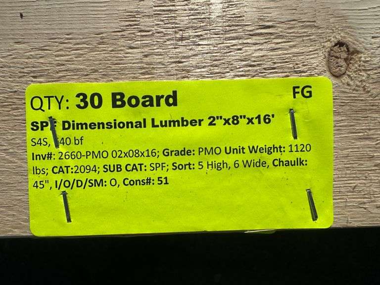 SPF Dimensional Lumber 2"x8"x16'. S4S, 640 Board Foot, Grade: PMO, *Condition Note: Split/Cracked Boards, Please See Photos* Weight: 1120. Sold by: Board. Sold as: Price x Quantity.