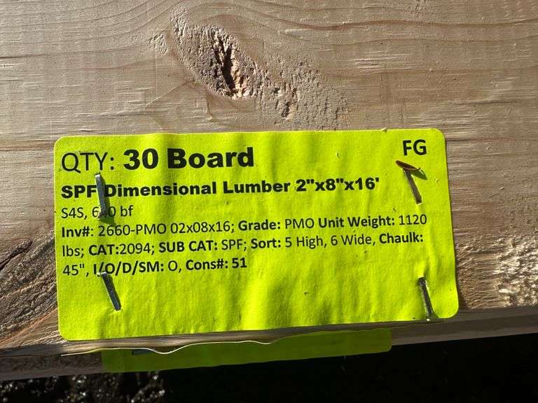 SPF Dimensional Lumber 2"x8"x16'. S4S, 640 Board Foot, Grade: PMO, *Condition Note: Split/Cracked Boards, Please See Photos* Weight: 1120. Sold by: Board. Sold as: Price x Quantity.