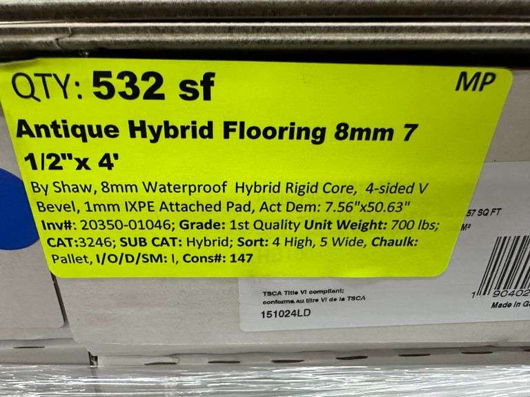 Antique Hybrid Flooring 8MMx7 1/2"x4'. By Shaw, 8mm Waterproof, Hybrid Rigid Core, 4-Sided V Bevel, 1mm IXPE Attached Pad, Actual Dimensions: 7.56"x50.63", Grade: 1st Quality Weight: 700. Sold by: Square Foot. Sold as: Price x Quantity.