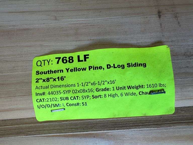 Southern Yellow Pine D-Log Siding 2"x8"x16'. Actual Dimensions 1-1/2"x6-1/2"x16', Grade: 1 Weight: 1610. Sold by: Linear Foot. Sold as: Price x Quantity.