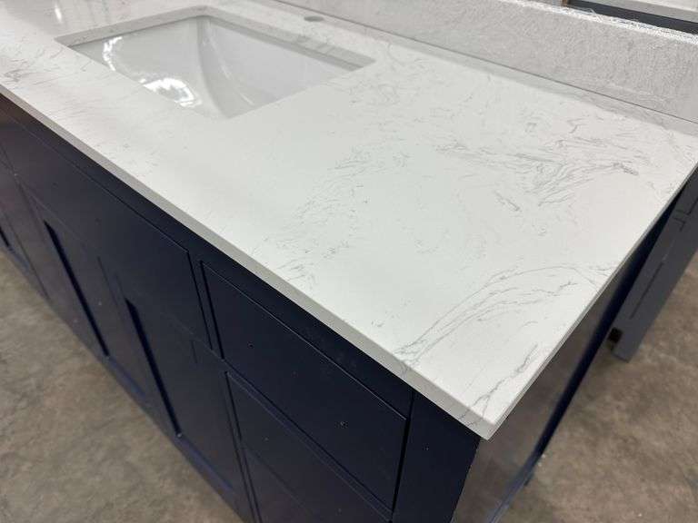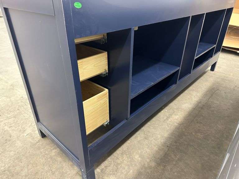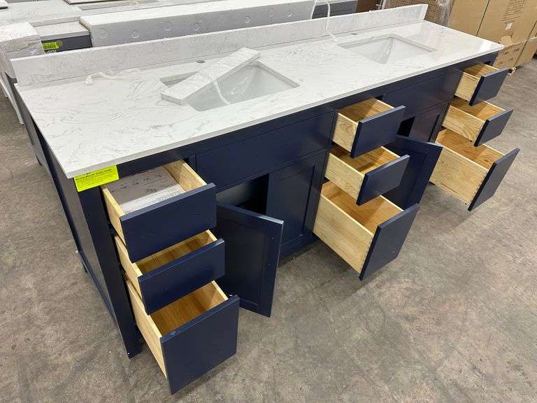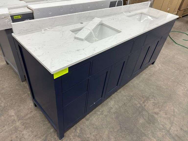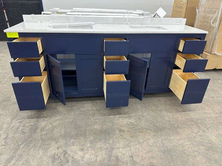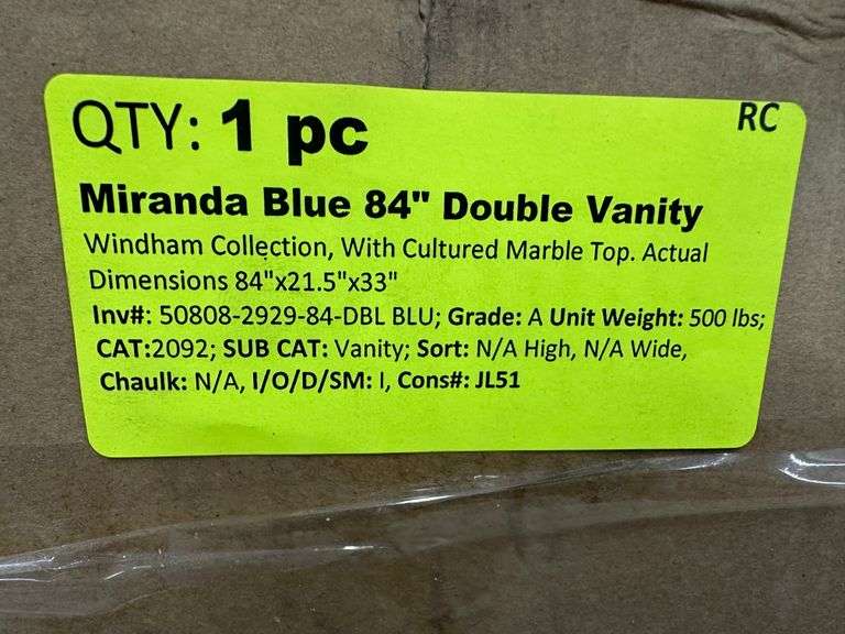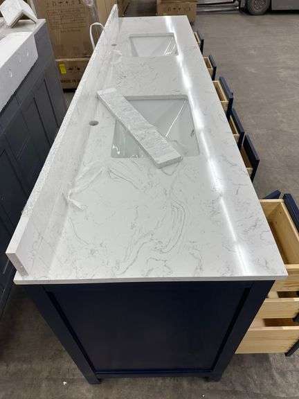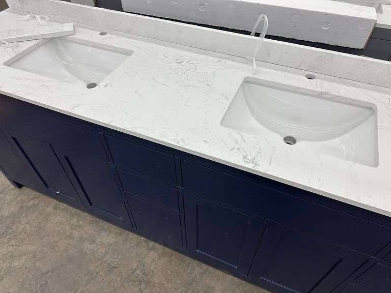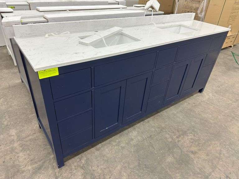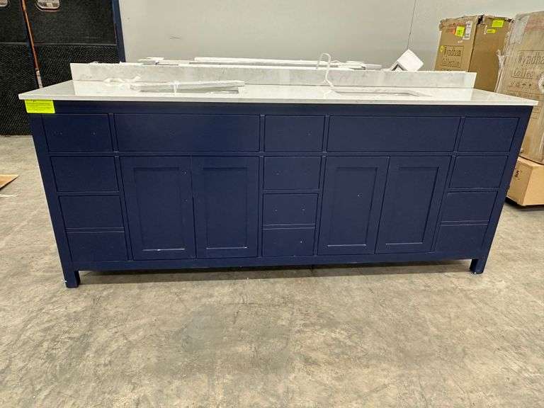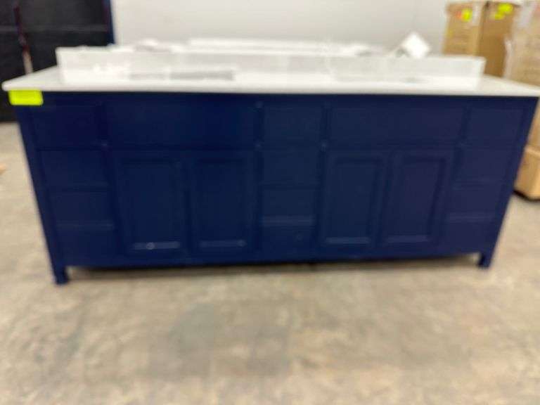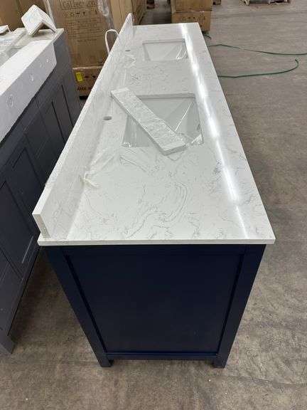 Miranda Blue 84" Double Vanity. Windham Collection, With Cultured Marble Top, Actual Dimensions: 84"x21.5"x33", Does Not Include Hardware, Grade: A *Condition Note: Damage to the box, Minimal scuff marks and scratches to vanity, Please See Photos* Weight: 500. Sold by: Piece. Sold as: Price x Quantity.