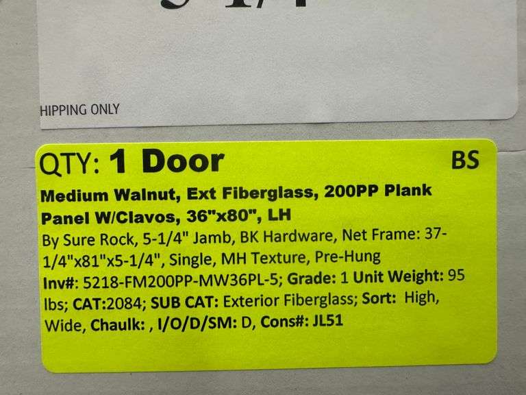Medium Walnut, Exterior Fiberglass, 200 PP Plank Pannel W/Clavos, 36"x80", LH. By Sure Rock, 5-1/4" Jamb, BK Hardware, Net Frame: 37-1/4"x81"x5-1/4", Single, MH Texture, Pre-Hung, Grade: 1 Weight: 95. Sold by: Door. Sold as: Price x Quantity.