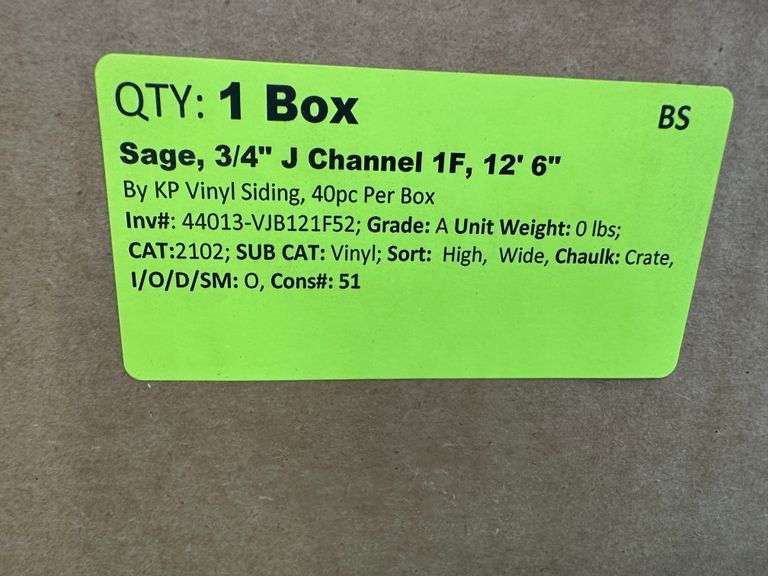 Sage 3/4" J Channel 1F 12' 6". By KP Vinyl Siding, 40 Piece per Box, Grade: A Weight: x. Sold by: Box. Sold as: Price x Quantity.