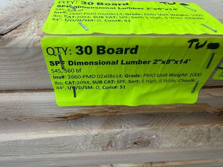 SPF Dimensional Lumber 2"x8"x14'. S4S, 560 Board Foot *Condition Notes: Splits/Cracks, Please See Photos* Weight: 1000. Sold by: Board. Sold as: Price x Quantity.