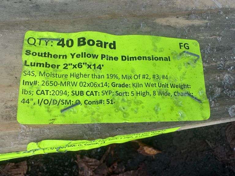 Southern Yellow Pine Dimensional Lumber 2"x6"x14'. S4S, Moisture Higher Than 19%, Mix Of #2, #3, & #4, Grade: Kiln Wet, *Condition Note: Mold, Please See Photos* Weight: x. Sold by: Board. Sold as: Price x Quantity.