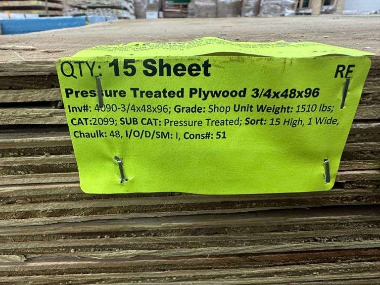 Pressure Treated Plywood 3/4"x48"x96". Grade: Shop *Condition Notes: Splits/Cracks, Please See Photos* Weight: 1510. Sold by: Sheet. Sold as: Price x Quantity.