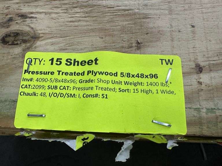 Pressure Treated Plywood 5/8"x48"x96". Grade: Shop *Condition Notes: Splits/Cracks, Please See Photos* Weight: 1400. Sold by: Sheet. Sold as: Price x Quantity.