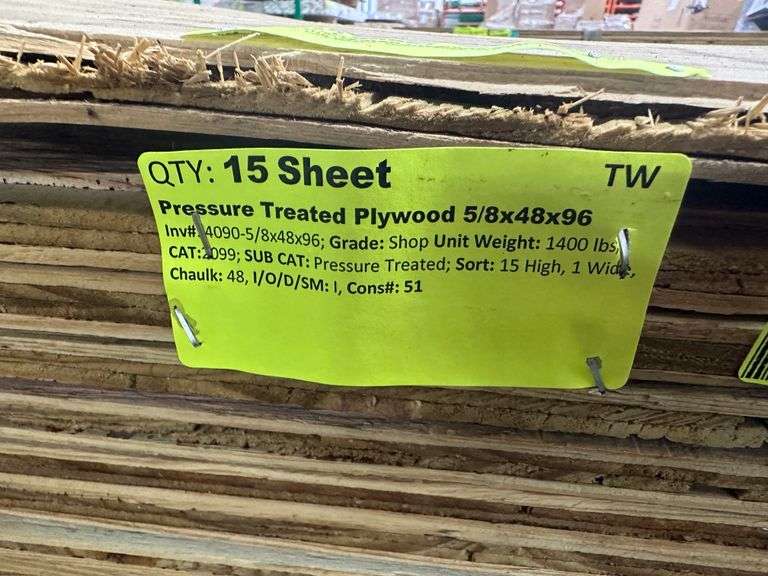 Pressure Treated Plywood 5/8"x48"x96". Grade: Shop *Condition Notes: Splits/Cracks, Please See Photos* Weight: 1400. Sold by: Sheet. Sold as: Price x Quantity.