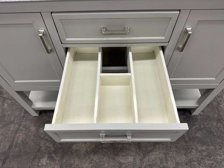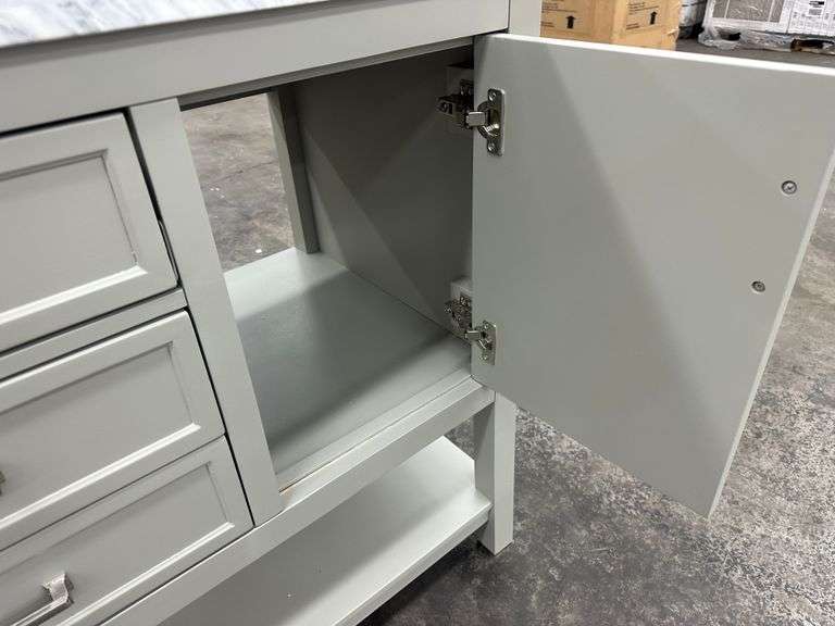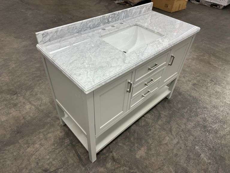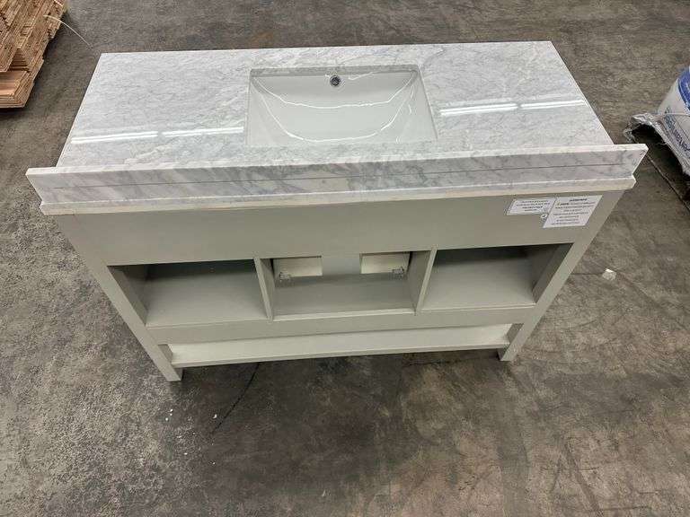Everett Grey Vanity 48". Home Decorators Collection, Gray Bath Vanity With White Carrara Marble Top 49"x22 x36", Grade: 1st Weight: 260. Sold by: Piece. Sold as: Price x Quantity.