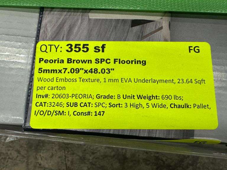 Peoria Brown SPC Flooring 5MMx7.09"x48.03". Wood Emboss Texture, 1mm EVA Underlayment, 23.64 Square Foot Per Carton, Grade: B Weight: 690. Sold by: Square Foot. Sold as: Price x Quantity.