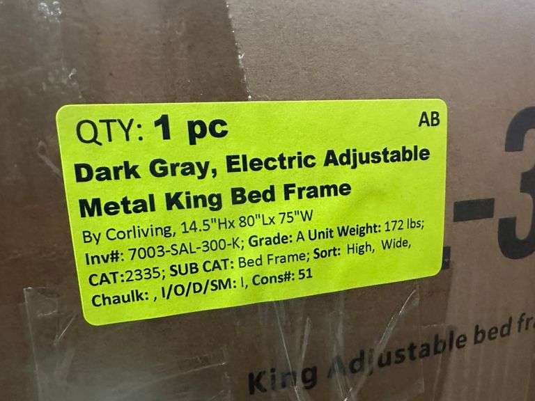 Dark Gray Electric Adjustable Metal King Bed Frame. By Corliving, 14.5"Hx80"Lx75"W Grade: A Weight: 172. Sold by: Piece. Sold as: Price x Quantity.