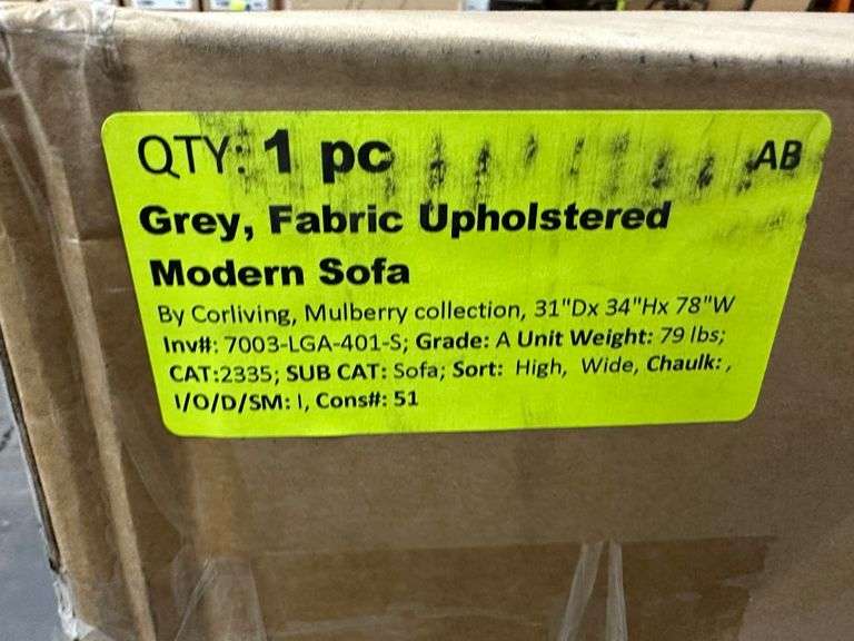 Gray Fabric Upholstered Modern Sofa. By Corliving, Mulberry Collection, 31"Dx 34"Hx 78"W Grade: A Weight: 79. Sold by: piece. Sold as: Price x Quantity.
