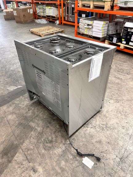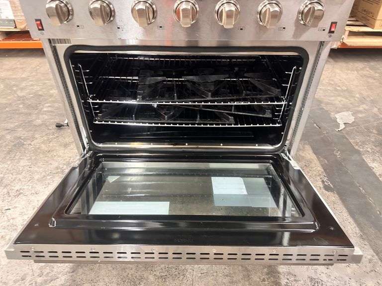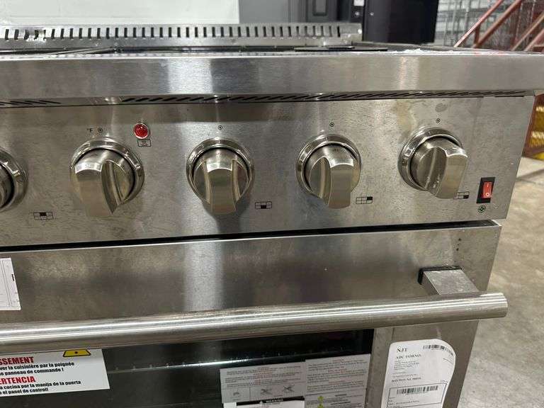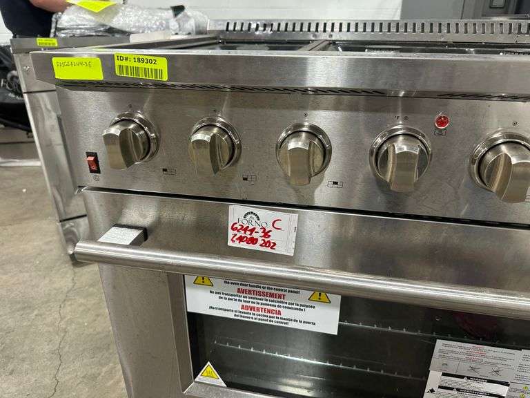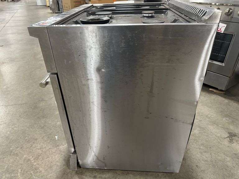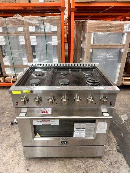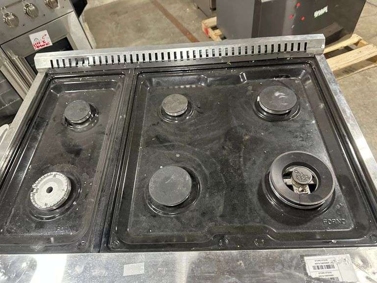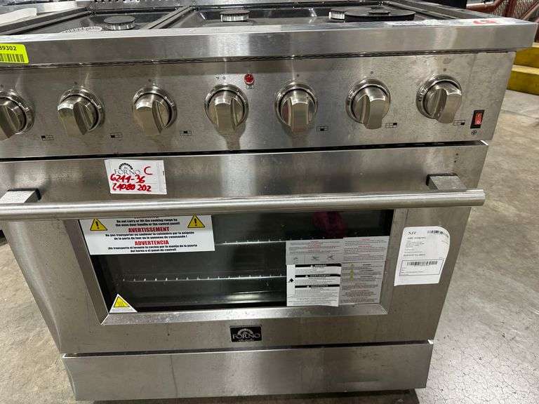 FORNO Galiano 36" 5.36 cu. ft. Gas Range with 6 Italian Burners. 36" W x 28.94" D x 37.7" H. Back panel is dented. Front kick plate is loose. One back leg is bent. Used and dirty. Front panel is dented. Weight: . Sold by: . Sold as: Price x Quantity.
