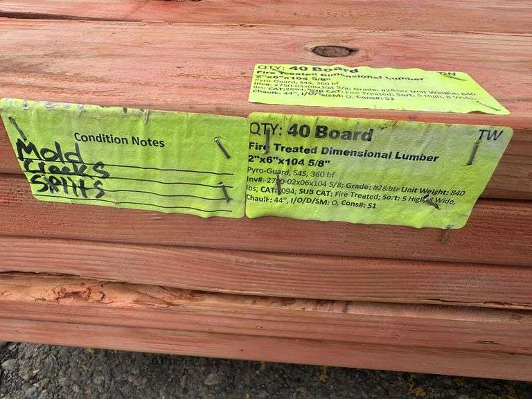 Fire Treated Dimensional Lumber 2"x6"x104 5/8". Pyro-Guard, S4S, 360 Board Foot, Grade: #2&btr * Condition Note: Mold, Splits and Cracks, Please See Photos * Weight: 840. Sold by: Board. Sold as: Price x Quantity.