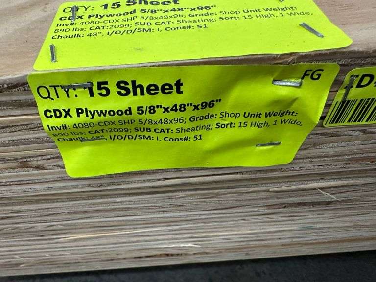 CDX Plywood 5/8"x48"x96". Grade: Shop. Weight: 890. Sold by: Sheet. Sold as: Price x Quantity.