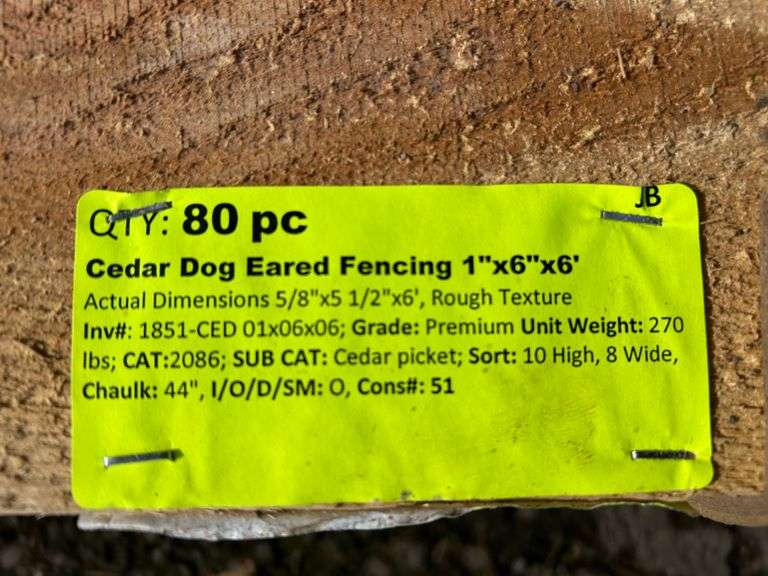 Cedar Dog Eared Fencing 1"x6"x6'. Actual Dimension: 5/8"x5 1/2"x6', Rough Texture, Grade: Premium Weight: 270. Sold by: Piece. Sold as: Price x Quantity.