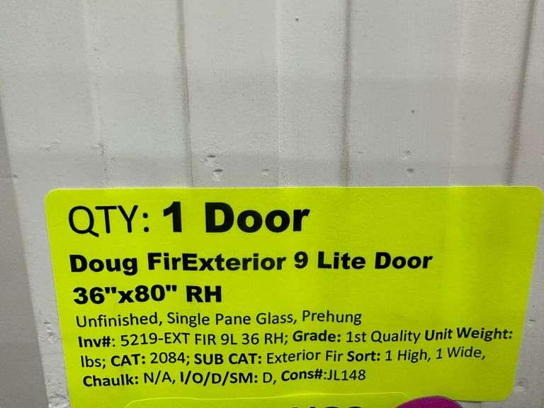 Doug Fir Exterior 9 Lite Door 36"x80" RH. Unfinished, Single Pane Glass, Prehung, Grade: 1st Quality Weight: x. Sold by: Door. Sold as: Price x Quantity.