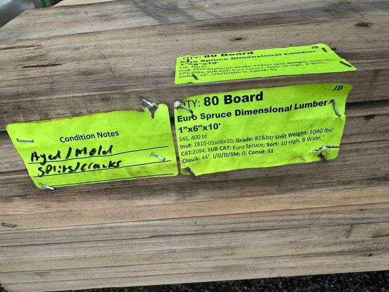 Euro Spruce Dimensional Lumber 1"x6"x10'. S4S, 400 Board Foot, Grade: #2&btr, *Condition Notes: Aged/Mold, Splits/Cracks, Please See Photos* Weight: 1040. Sold by: Board. Sold as: Price x Quantity.
