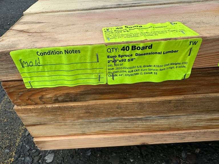Euro Spruce Dimensional Lumber 2"x6"x92 5/8". S4S, 320 Board Foot, Grade #2&btr, *Condition Note: Mold, Please See Photos* Weight: 830. Sold by: Board. Sold as: Price x Quantity.