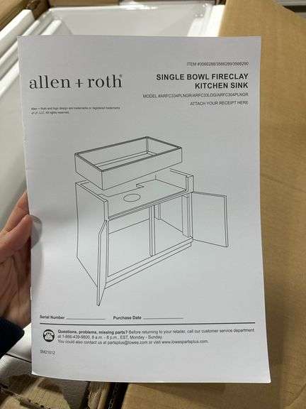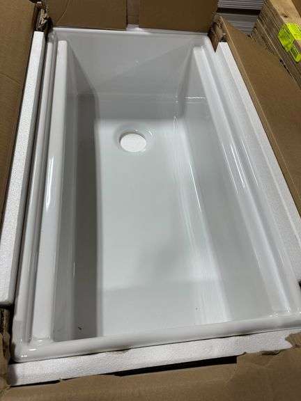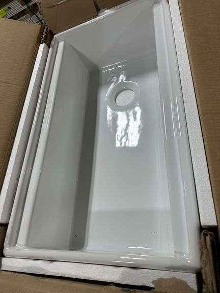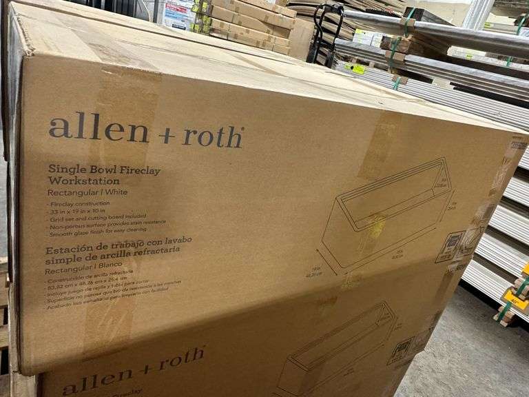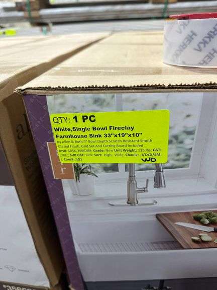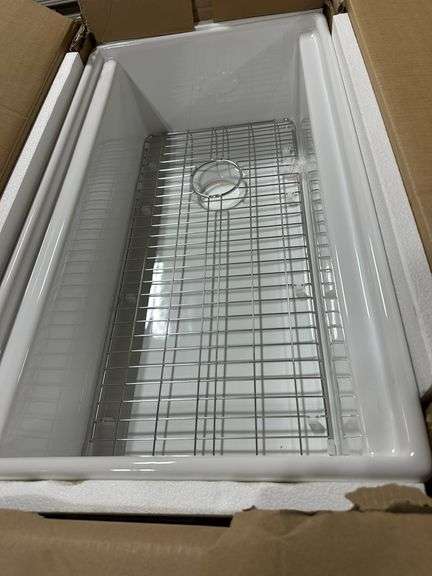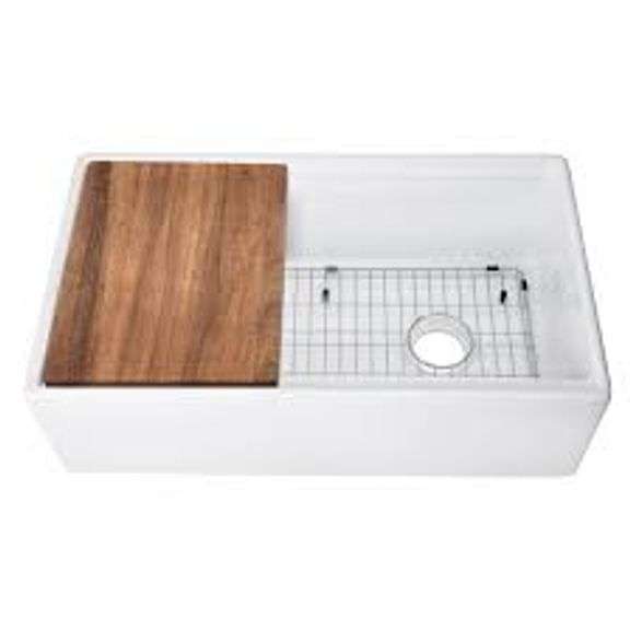 White Single Bowl Fireclay Farmhouse Sink 33"x19"x10". By: Allen & Roth 9" Bowl Depth Scratch Resistant Smooth Glazed Finish, Grid Set And Cutting Board Included, Grade: New Weight: 115. Sold by: Piece. Sold as: Price x Quantity.