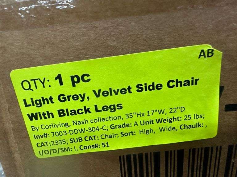 Light Grey Velvet Side Chair with Black Legs. By Corliving, Nash Collection, 35"Hx 17"W, 22"D Grade: A Weight: 25. Sold by: Piece. Sold as: Price x Quantity.