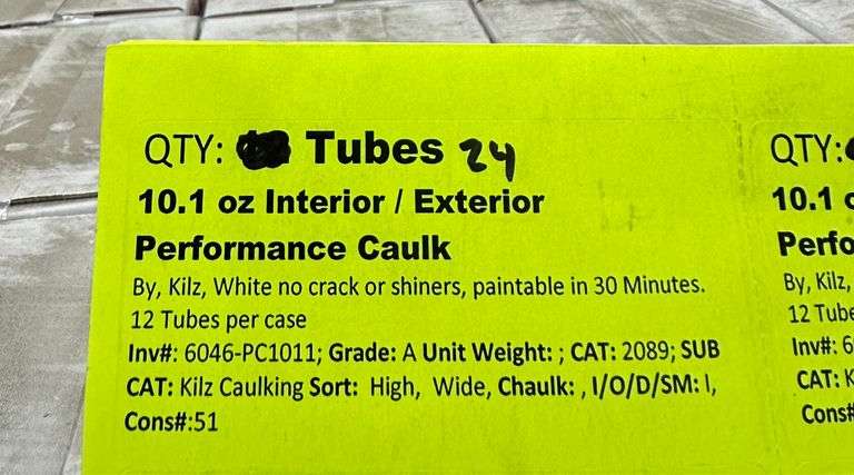 10.1 oz Interior/Exterior Performance Caulk. By Kilz, White no crack or shiners, paintable in 30 minutes. 2 cases, 12 tubes per case. Grade: A Weight: 56. Sold by: Tube. Sold as: Price x Quantity.