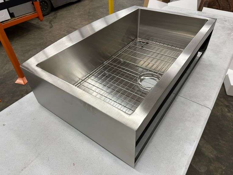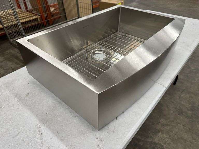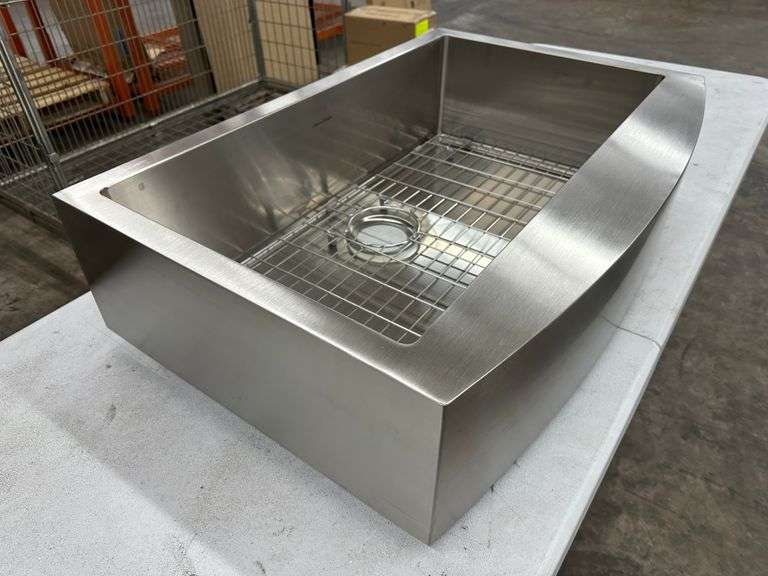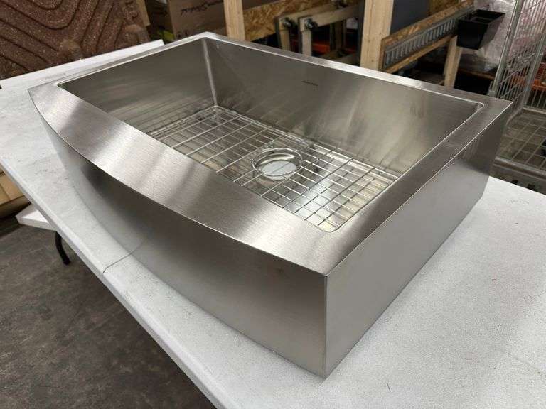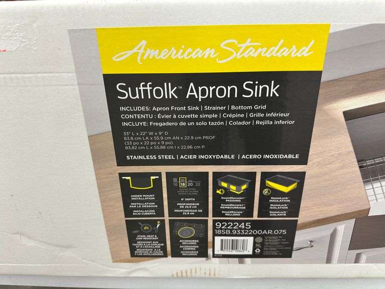 Suffolk 33"x22" Stainless Steel Undermount Single-Bowl Apron Front/Farmhouse Residential Kitchen Sin. By American Standard, 18-Gauge Stainless Steel, Noise Reducing Features, Includes Drain and Stainless Steel Bottom Grid, Actual Dimensions: 33"L x 22"W x 9"D Grade: A Weight: 36. Sold by: Piece. Sold as: Price x Quantity.