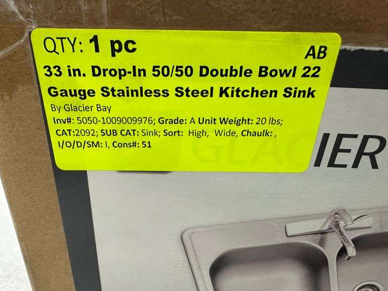 33" Drop-In 50/50 Double Bowl 22 Gauge Stainless Steel Kitchen Sink. By, Glacier Bay Grade: A Weight: 20. Sold by: Piece. Sold as: Price x Quantity.