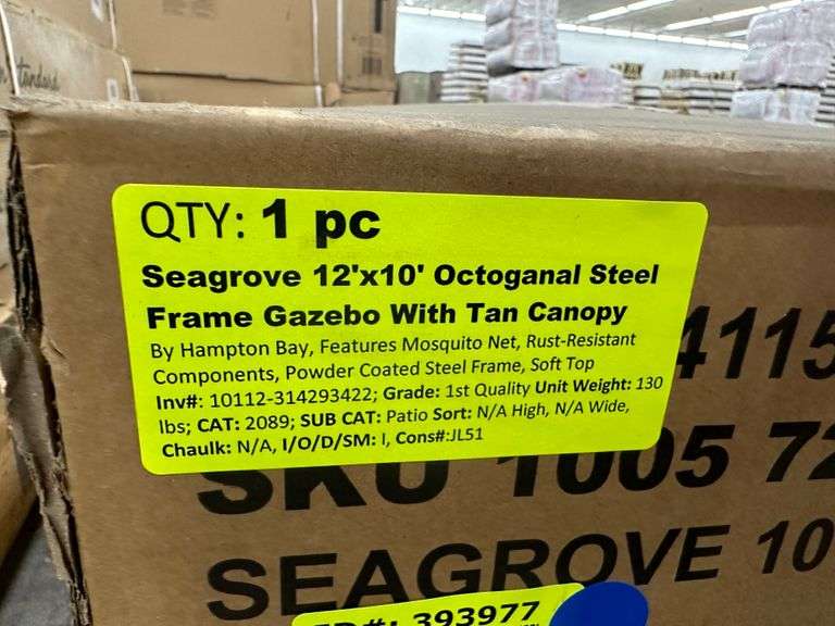Seagrove 12'x10' Octagonal Steel Frame Gazebo with Tan Canopy. By Hampton Bay, Features Mosquito Net, Rust-Resistant Components, Powder Coated Steel Frame, Soft Top, Grade: 1st Quality Weight: 130. Sold by: Piece. Sold as: Price x Quantity.