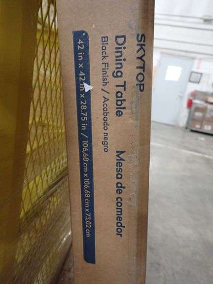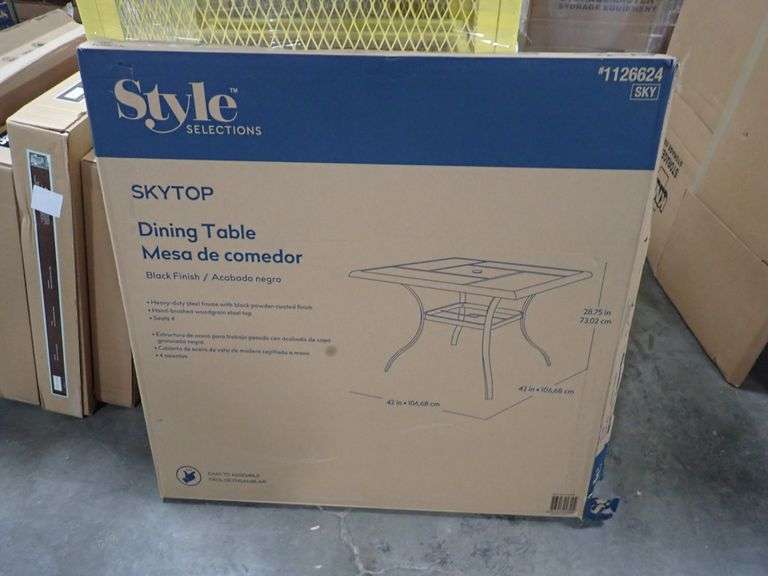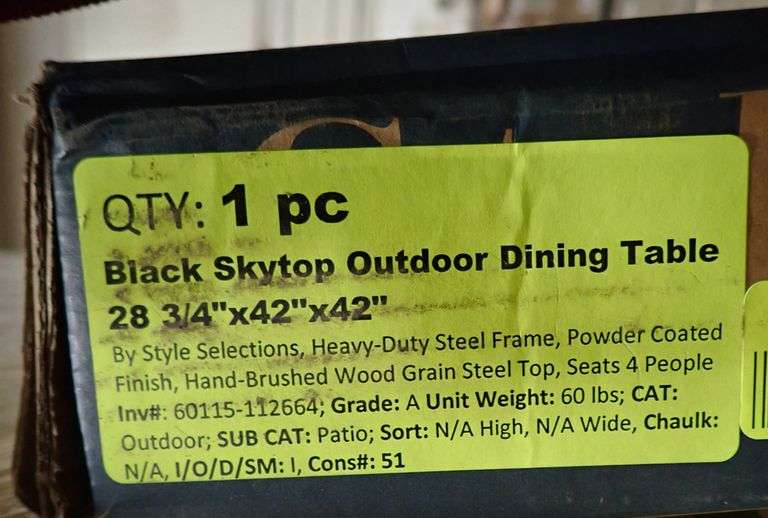 Black Skytop Outdoor Dining Table 28 3/4" x42"x 42". By Style Selections, Heavy-Duty Steel Frame, Powder Coated Finish, Hand-Brushed Wood Grain Steel Top, Seats 4 People, Grade: A. Weight: 60. Sold by: Piece. Sold as: Price x Quantity.