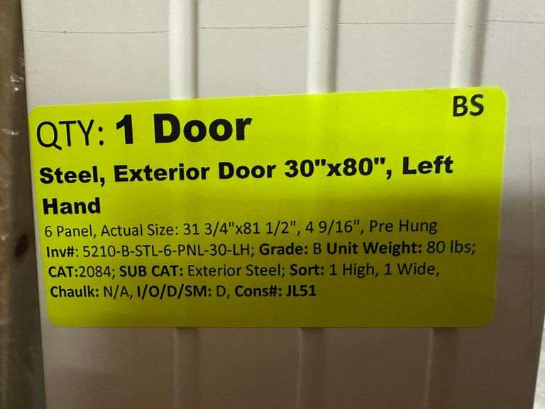 Steel Exterior 6 Panel Door 30"x80" Left Hand. Actual Size: 31 3/4"x81 1/2", 4 9/16", Pre Hung, Grade: B Weight: 80. Sold by: Door. Sold as: Price x Quantity.