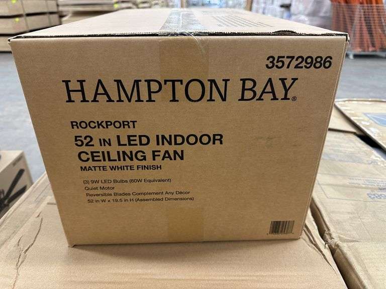 Rockport 52" LED Indoor Ceiling Fan. By Hampton Bay, Matte White Finish, (3) 9W LED Bulbs, Quiet Motor Technology, Reversable Blades, Assembled Dimensions 52"x19.5", Grade: A Weight: 25. Sold by: Piece. Sold as: Price x Quantity.