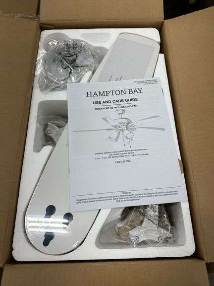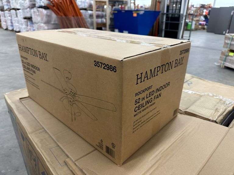 Rockport 52" LED Indoor Ceiling Fan. By Hampton Bay, Matte White Finish, (3) 9W LED Bulbs, Quiet Motor Technology, Reversable Blades, Assembled Dimensions 52"x19.5", Grade: A Weight: 25. Sold by: Piece. Sold as: Price x Quantity.