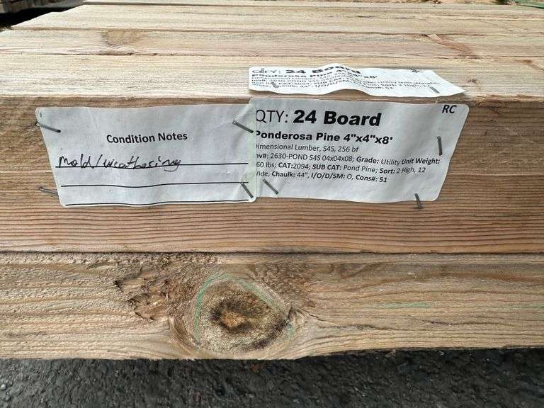Ponderosa Pine Dimensional Lumber 4"x4"x8'. S4S, 256 Board Foot, Grade: Utility * Condition Note: Mold, Weathering, Please See Photos * Weight: x. Sold by: Board. Sold as: Price x Quantity.