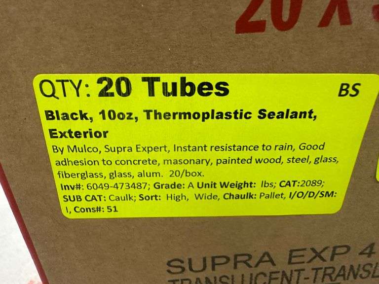 Black 10oz Thermoplastic Sealant Exterior. By Mulco, Supra Expert, Instant Resistance to Rain, Good Adhesion to Concrete, Masonry, Painted Wood, Steel, Glass, Fiberglass, Aluminum 20/box Grade: A Weight: x. Sold by: Tube. Sold as: Price x Quantity.