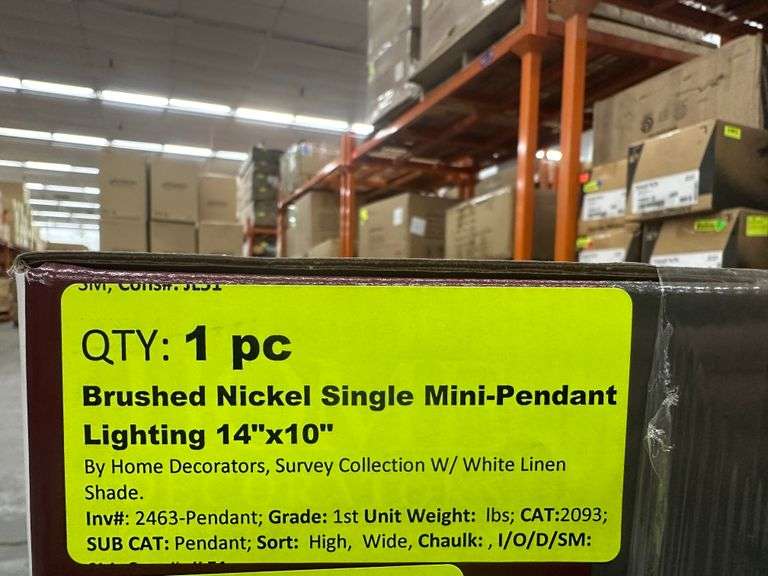 Brushed Nickel Single Mini-Pendant Lighting 14" x 10" (4pack). By Home Decorators, Survey Collection With White Linen Shade. Grade: 1st Weight: x. Sold by: Piece . Sold as: Price x Quantity.