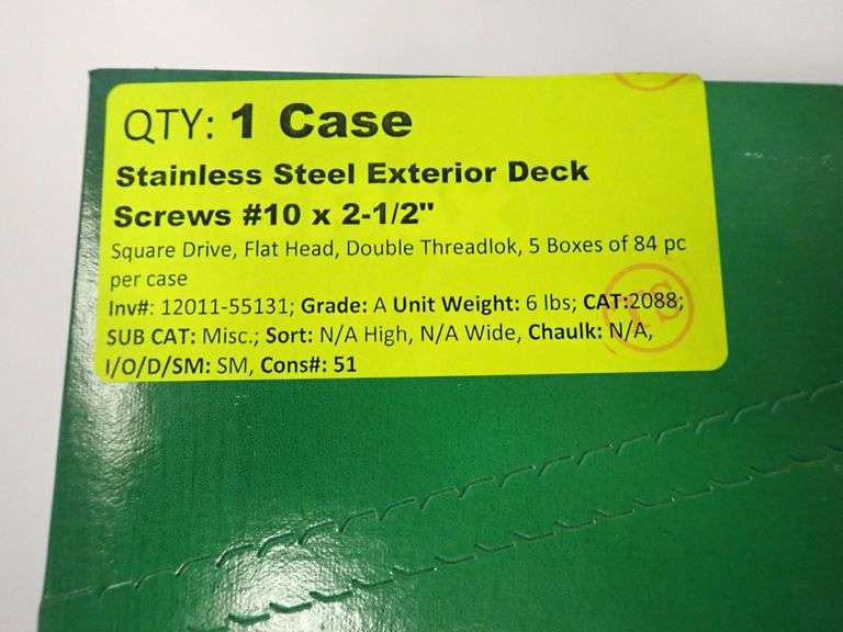 Stainless Steel Exterior Deck Screws #10 x 2 1/2". Square Drive, Flat Head, Double Threadlocks, 5 Boxes of 84 Pieces per Case, Grade: A Weight: 6. Sold by: Case. Sold as: Price x Quantity.