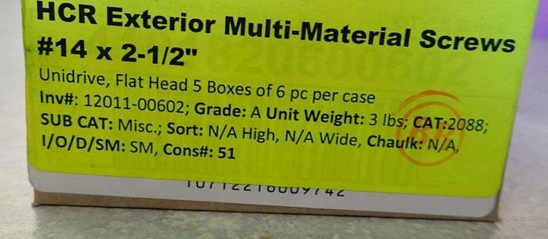 HCR Exterior Multi-Material Screws #14 x 2-1/2". Unidrive, Flat Head, 5 Boxes Of 6 Pieces Per Case, Grade: A Weight: 3. Sold by: Case. Sold as: Price x Quantity.