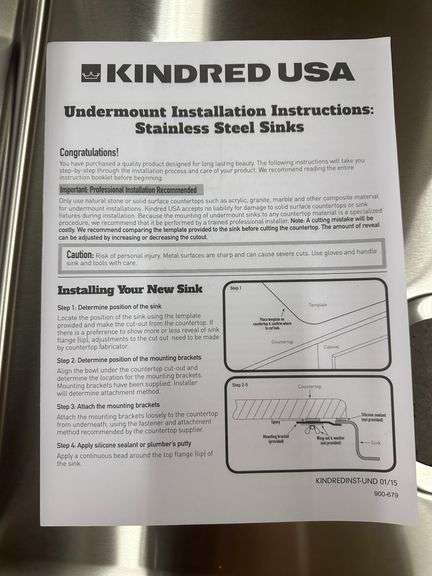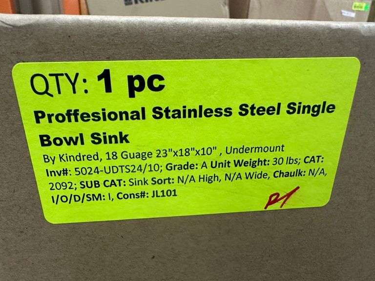 Professional Stainless Steel Single Bowl Sink. By Kindred, 18 Guage 23"x18"x10", Undermount, Grade: A Weight: 30. Sold by: Piece. Sold as: Price x Quantity.