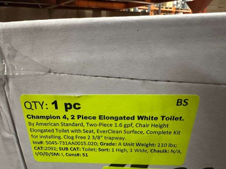 2 Piece Champion 4 Elongated White Toilet. By: American Standard, Two-Pieces, 1.6 GPF, Chair Height, Elongated Toilet with Seat, EverClean Surface, Complete Kit For Installation, Clog Free 2 3/8" Trapway, Grade: A Weight: 110. Sold by: Piece. Sold as: Price x Quantity.
