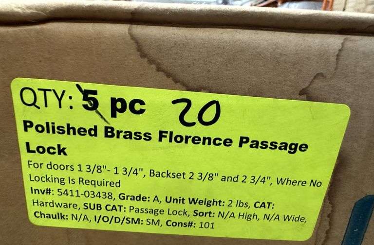 Polished Brass Florence Passage Lock. For Door 1 3/8"-1 3/4", Backset 2 3/8" and 2 3/4", Where No Locking is Required, Grade: A Weight: 2. Sold by: Piece. Sold as: Price x Quantity.