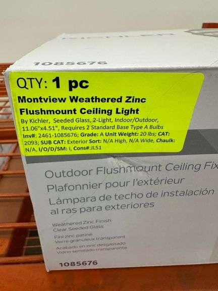 Montview Outdoor Flushmount Ceiling Fixture Light. By: Kichler, Weathered Zinc Finish, Clear Seeded Glass, 11.06"x4.51" .2 Standard Base, Type-A Bulbs Required, Grade: A Weight: 3. Sold by: Piece. Sold as: Price x Quantity.
