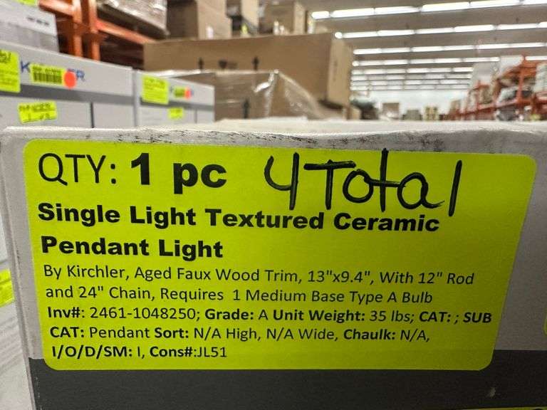 Single Light Textured Ceramic Pendant Light. By: Kichler, Aged Faux Wood Trim, 13"x9.4", With 12" Rod and 24" Chain, Requires 1 Medium Base Type A Bulb, Grade: A Weight: 35. Sold by: Piece. Sold as: Price x Quantity.