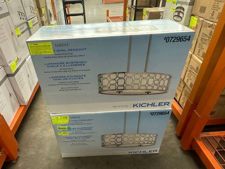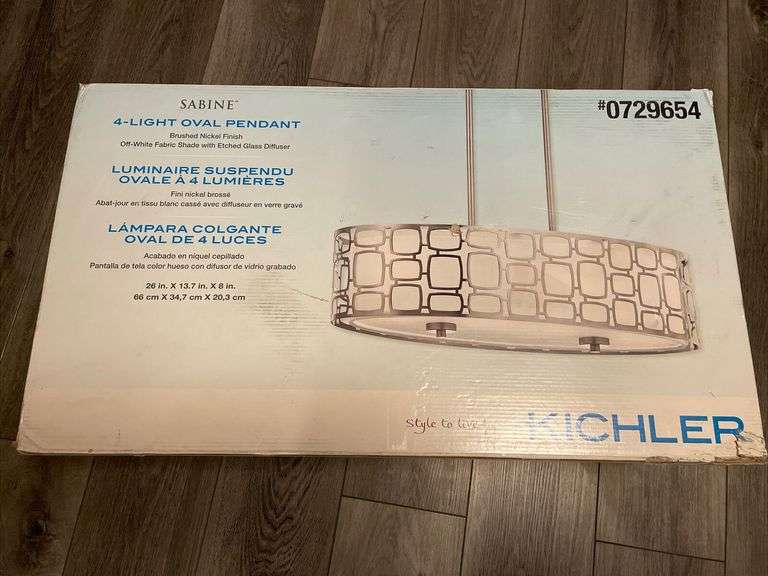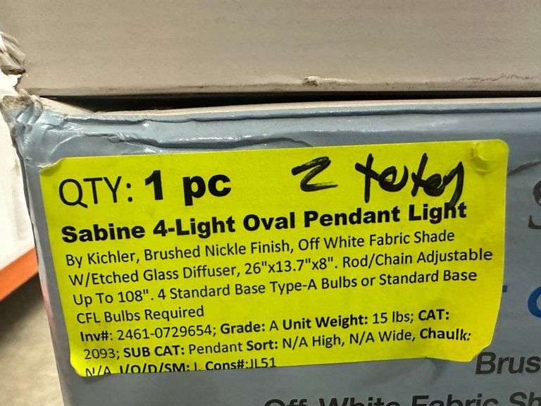 Sabine 4-Light Oval Pendant Light. By: Kichler, Brushed Nickel Finish, Off White Fabric Shade With Etched Glass Diffuser, 26"x13.7"x8" Rod/Chain Adjustable up to 108" .4 Standard Base, Type-A Bulbs or Standard Base, CFL Bulbs Required, Grade: A Weight: 15. Sold by: Piece. Sold as: Price x Quantity.